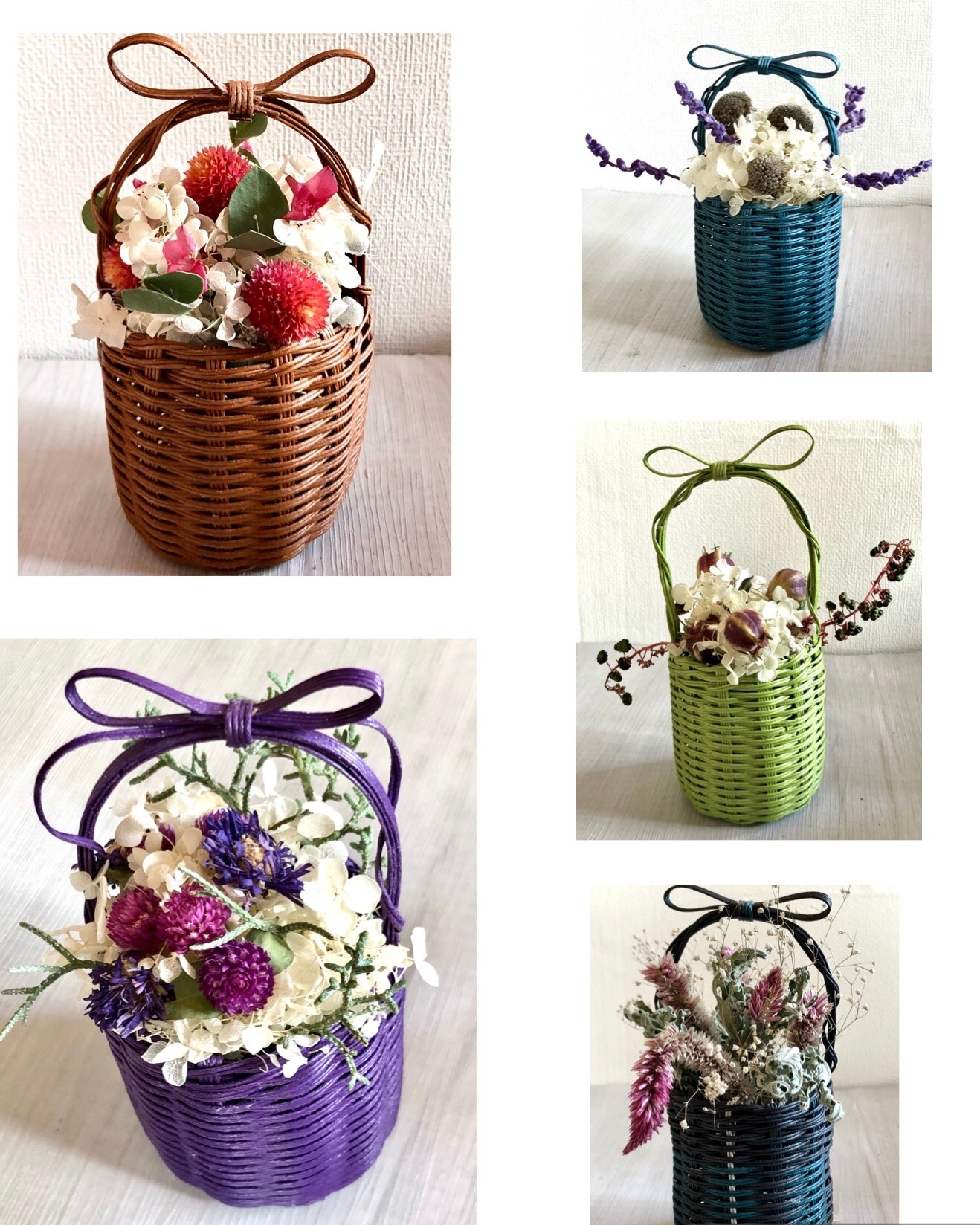 アンティークでレトロな風合いのクラフトテープバスケットとドライフラワーミニブーケ