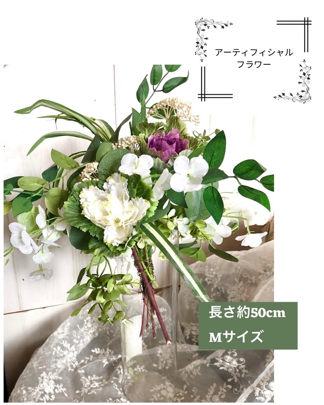 フラワーベース用のアレンジメントです そのまま花瓶などに飾ってください 備考欄にご記入お願いします↓ フラワーベースの 素材(瓶、陶器など) 高さ 開口部の直径 底面の直径 をお知らせくださればピッタリサイズのアレンジメントをお届けします また、スワッグとして飾ることも可能ですので、その旨備考欄に明記頂ければ、スワッグ仕様でお届けいたします 基本の花材 アナベルホワイト ユーカリ ススキの葉 アガパンサスの実 菖蒲やシランの実 カスミソウ に見立てたアーティフィシャルフラワーなど 他の花材も下記のお花に見立てたアーティフィシャルフラワーでアレンジしています イエロー系 ルドベキア ジニア ゴールデンスティック ミモザ スターチス ハハコグサ ラナンキュラスゴールドコイン パープル系 ジニア アメジストセージ ノゲイトウ 千日紅 アガパンサス ニゲラの実 タチアオイ スターチス ツルニチニチソウ ピンク系 アリウム コンブレナラブラブラブ 千日紅 薔薇 タチアオイ ブルー系 秋色アジサイ ブルー染アジサイ コバルトセージ ツユクサ ティルファニウム レッド系 ジニア レッド染アジサイ 鷹の爪 ヨウシュヤマゴボウ 薔薇 その他花材 ドドナエナ 黄金コノテヒバ ヒノキ科コニファー セイヨウイワナンテン クリスマスローズ (アレンジメントによりバランスでプラスされます) サイズ: 50cm×30cm×花瓶高さ20cm〜25cm