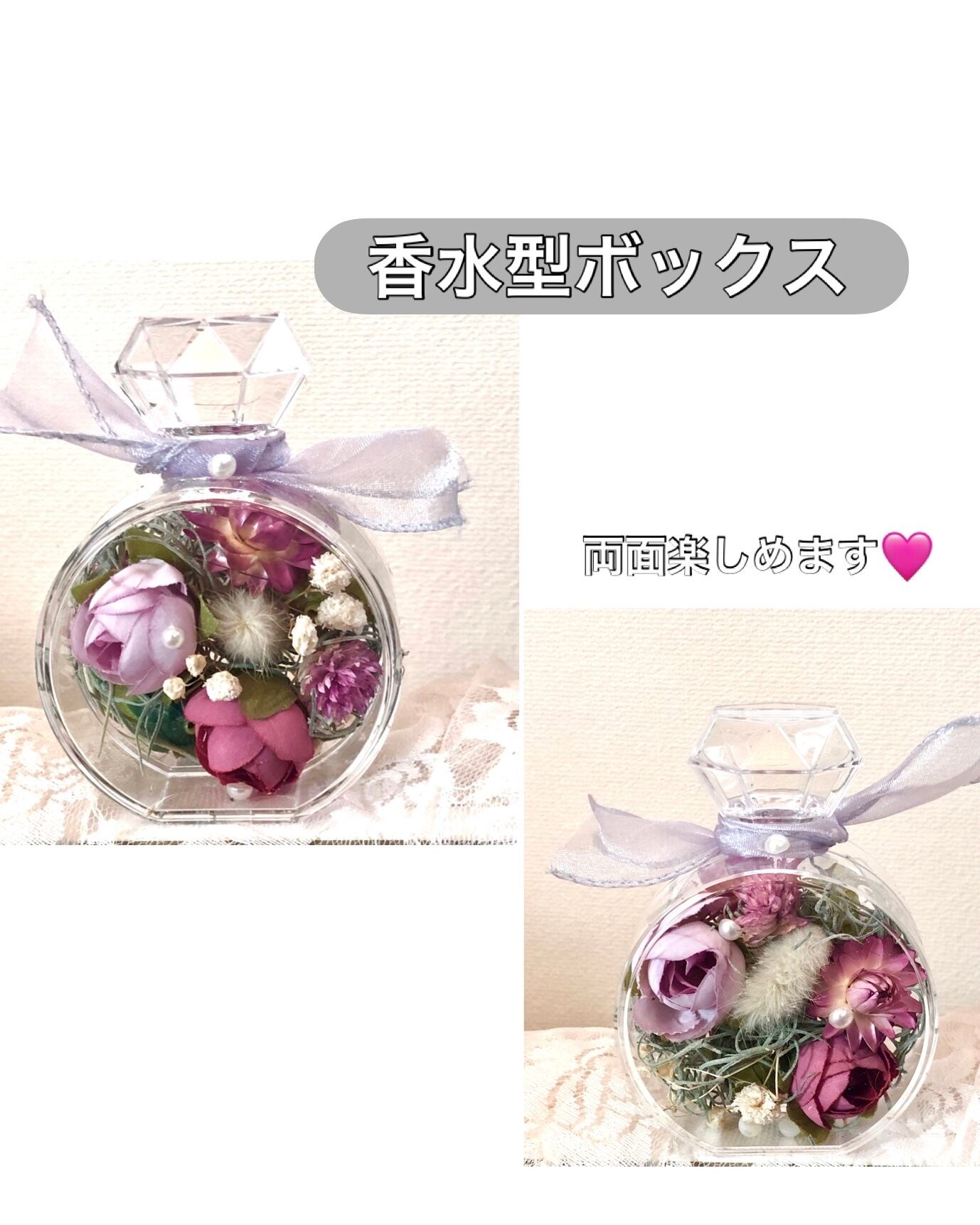 女性に人気の香水瓶型ボックスに両面から見えるようアレンジしました