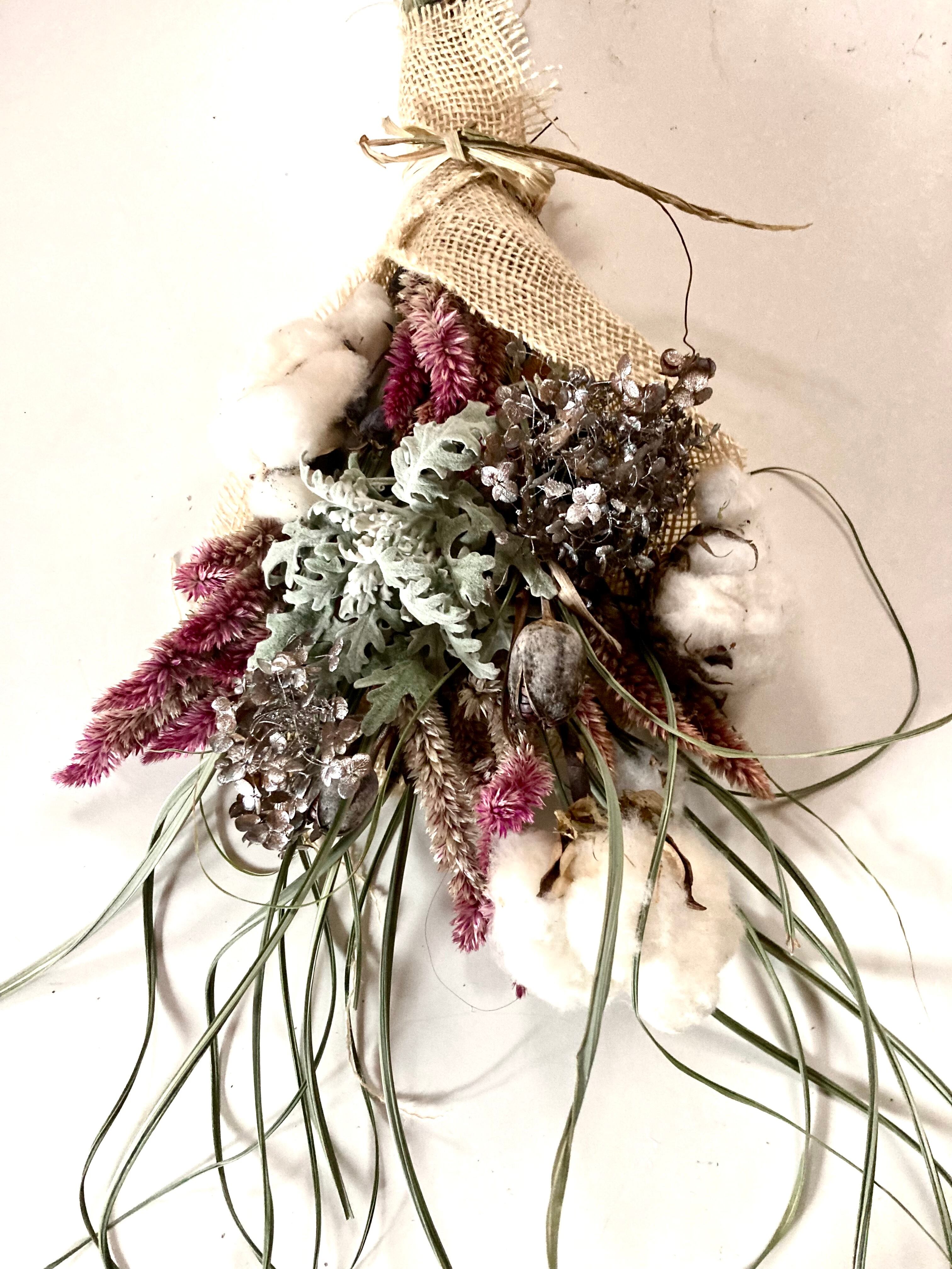 秋から雪の降るまで、ワイルドガーデンに咲くお花たちのシルバーホワイト系スワッグ