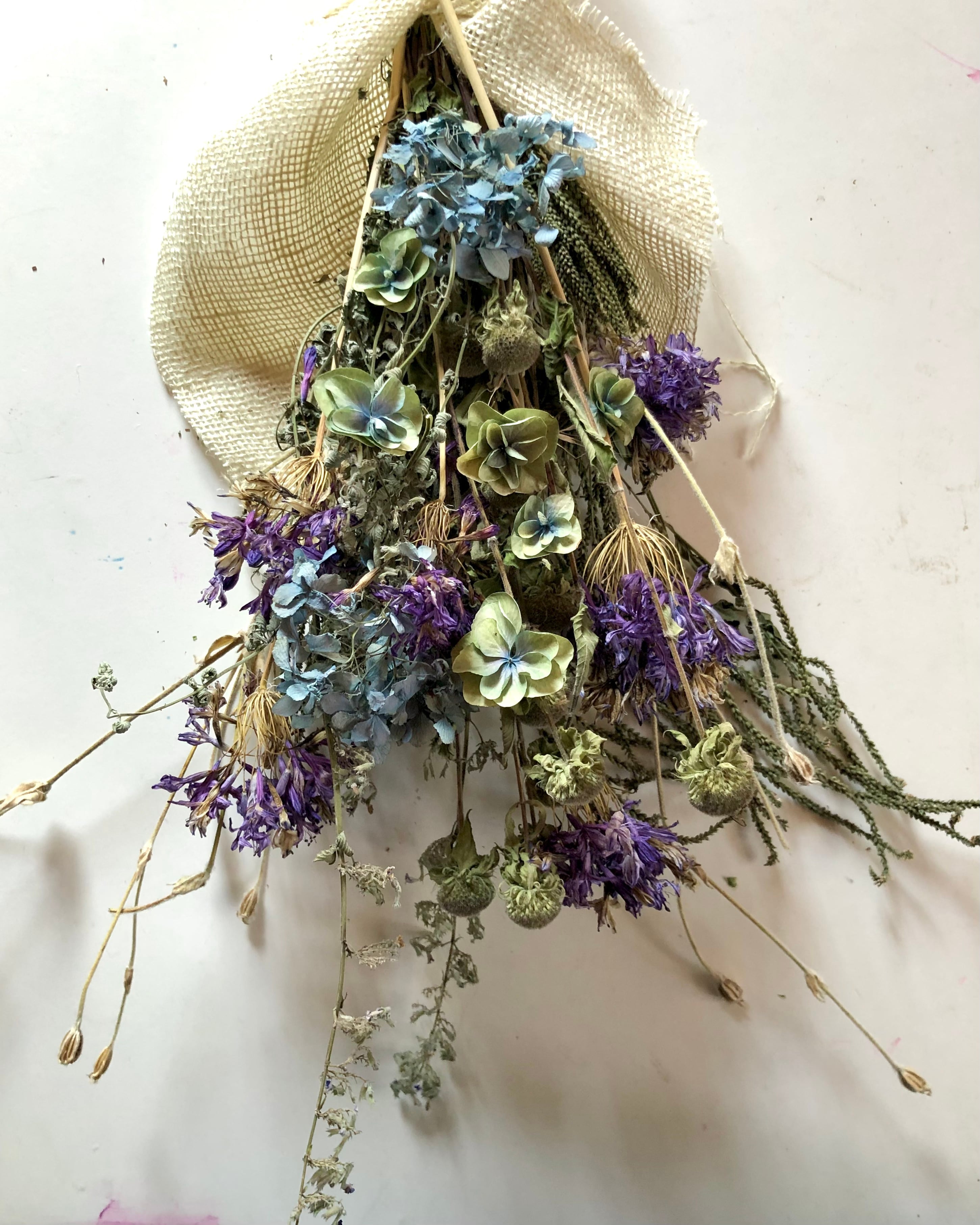 ⚪︎アジサイのライトブルーとアガパンサスのパープルをメインに、ハーブを組み合わせたアンティーク色のスワッグ