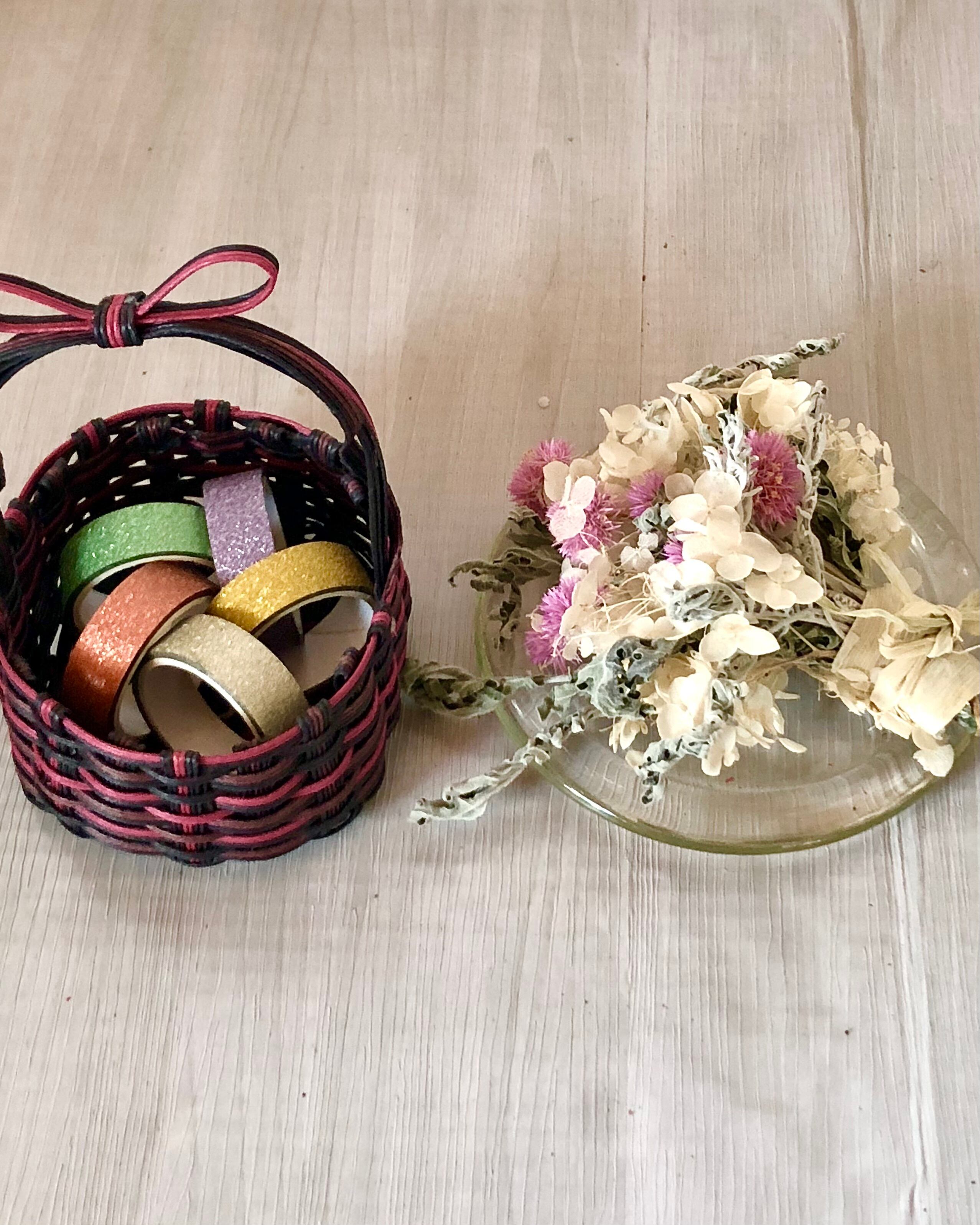 アンティークでレトロな風合いのクラフトテープバスケットとドライフラワーコサージュ型